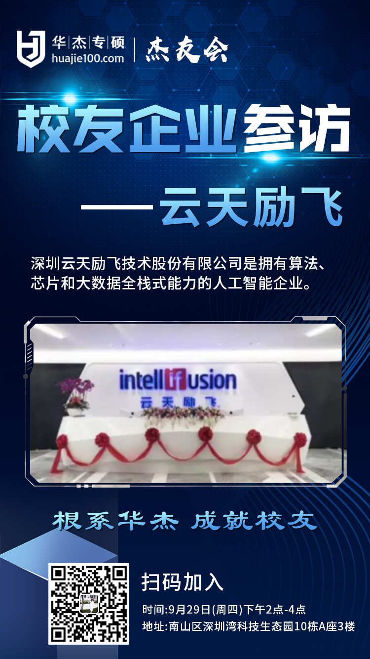 9月29日(周四)下午2点,华杰校友企业参访将走进【深圳云天励飞技术股份有限公司】交流学习!